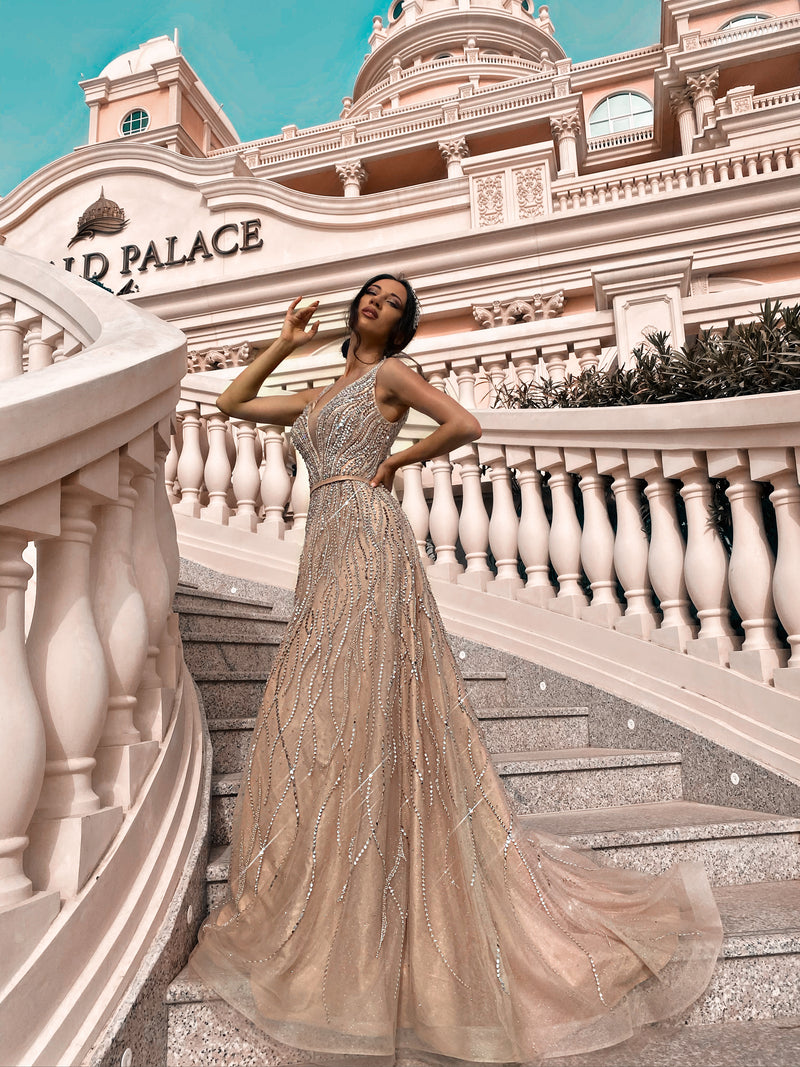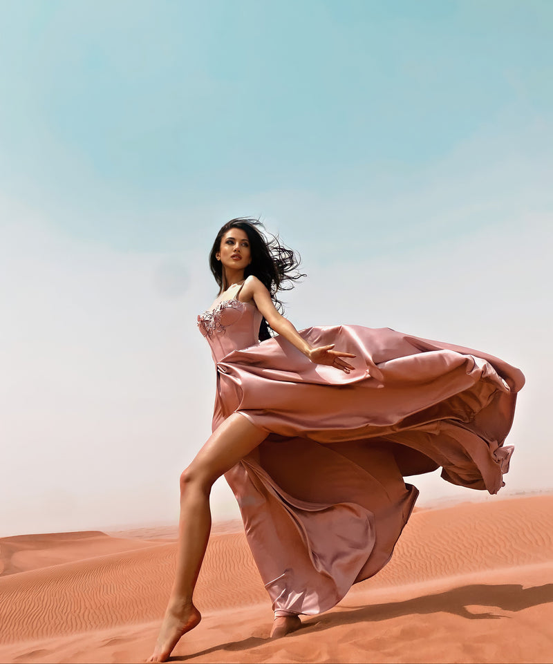 Shot in Dubai, the Spring–Summer 2021 Collection Sands of Mirage combines glamour and refinement, expressed in every gown: soft Italian satins, shimmering French laces, hand-embroidered floral motifs, and sparkling details that catch the light with every movement.