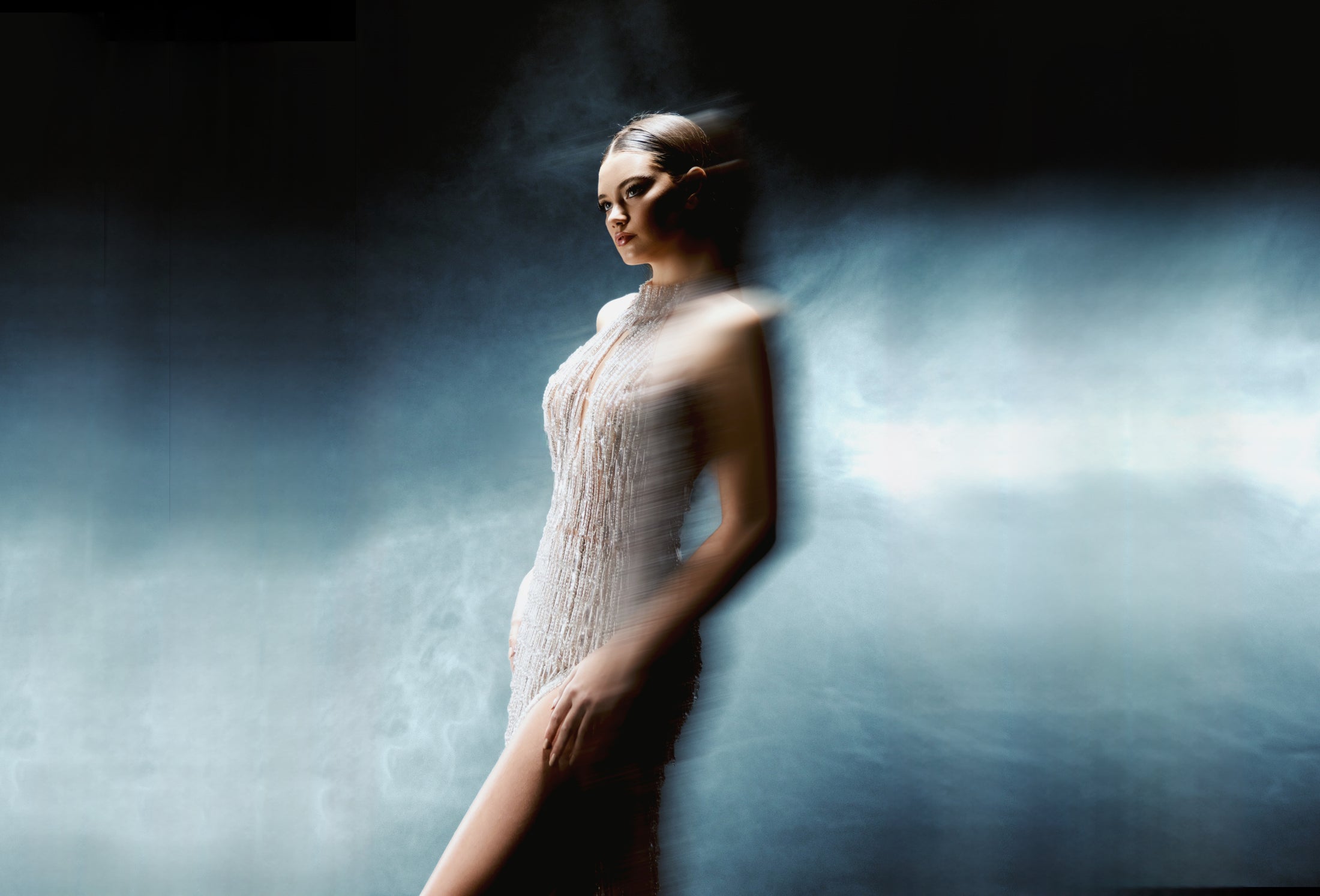 Акцентите на колекцията са роклята Aurelia — първият ни „течен" дизайн в наситено синьо, превърнал се в един от най-емблематичните ни модели, както и роклята Crystalline — шедьовър, създаден от над 50 000 ръчно нашити детайла, чиято изработка отне 3 месеца.
